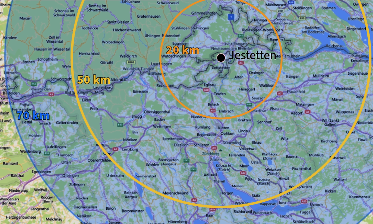 Die Rapperswiler könnten dabei neidisch auf die Rütner sein, genauso wie die Steinhauser auf die Knonauer: die zweitgenannten Gemeinden liegen innerhalb des errechneten Radius von 50 Kilometer Luftlinie, von der es sich noch lohnt, nach Jestetten in Deutschland zum Einkaufen zu fahren. Die erstgenannten Gemeinden hingegen liegen ausserhalb dieser Linie.