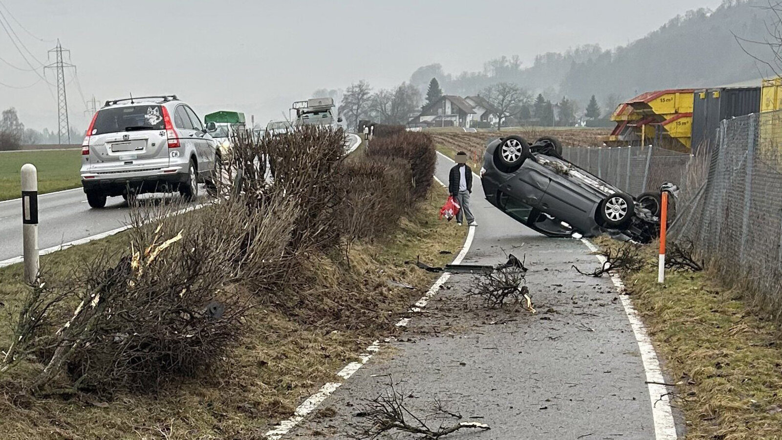 Die Bruchlandung war damit noch nicht vorbei: Nach dem Sturz überschlug sich der VW und blieb schliesslich auf dem Dach liegen – ausgerechnet auf einem angrenzenden Veloweg.