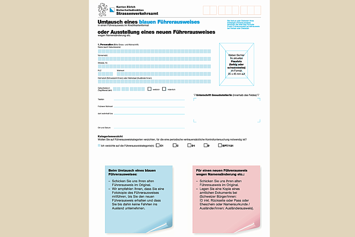 Wer jetzt noch wechseln muss, findet das nötige Formular beim Strassenverkehrsamt im Wohnkanton. Der Antrag kann vor Ort, per Post oder online eingereicht werden. Der neue Führerausweis im Kreditkartenformat wird innert wenigen Tagen per Post zugestellt.