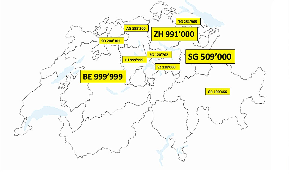 In bevölkerungsreichen Kantonen mit viel Pendelverkehr, Firmenwagen und hoher Zuzugsrate steigen die Nummern besonders rasant. Zürich ist das bekannteste Beispiel. Aktuell bewegt man sich im Bereich um ZH 991 000, wie das Strassenverkehrsamt Zürich mitteilt. Die Million ist für Zürich also in Reichweite. «Die Nummern werden nicht linear vergeben – durch Abmeldungen, Todesfälle oder Fahrzeugwechsel gibt es immer wieder Unterbrüche. Die Million wird kommen, wir wissen nur noch nicht genau wann», erklärt das Amt auf Anfrage.