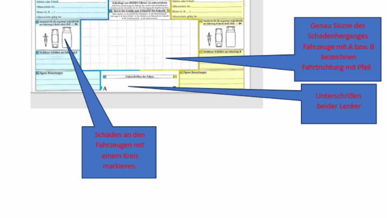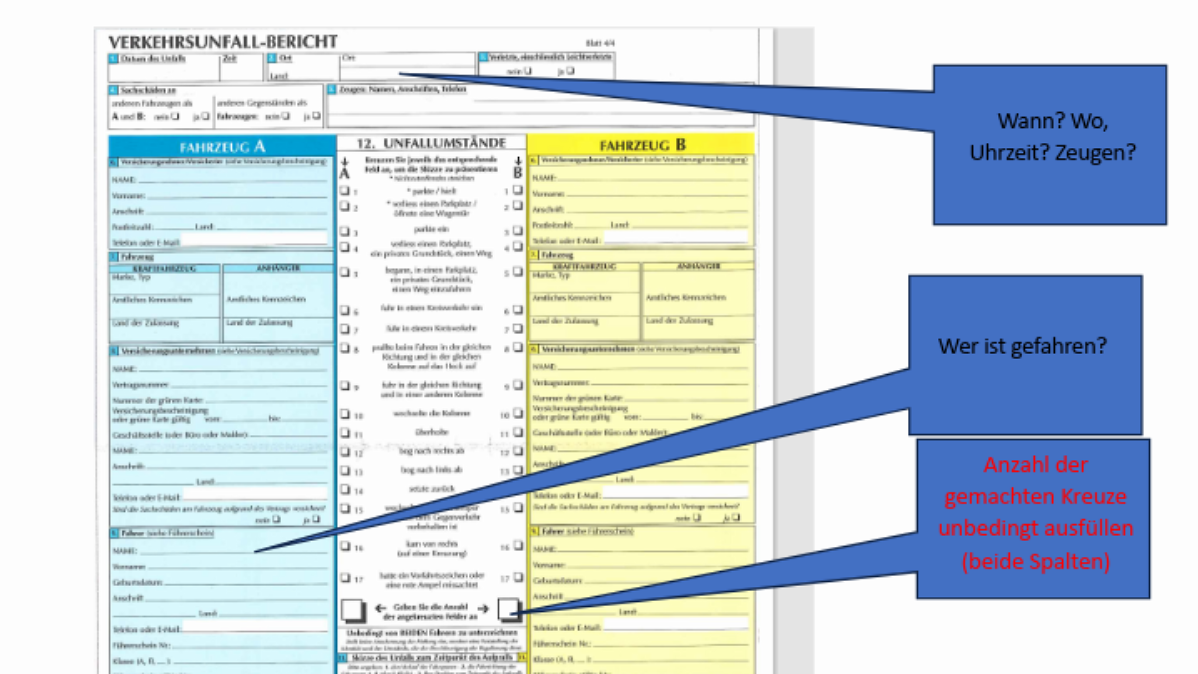 - Darauf achten, dass das Doppel auch sauber ausgefüllt wird (Durchschlag). Das komplett ausgefüllte Doppel erhält der Unfallgegner