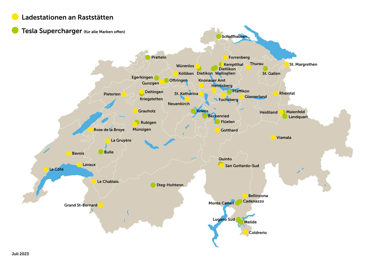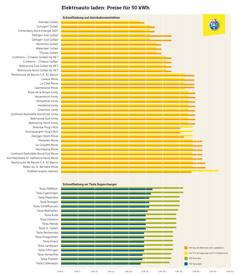 Anders ist das bei den Ladestationen. Dort ist der Preisdschungel nur weniger durchsichtig. Die Preise sind nicht sichtbar angeschrieben. Zudem unterscheiden sie sich nicht nur in der Höhe, sondern auch in der Berechnung. Der Touring Club Schweiz TCS hat deshalb die Preise an 35 Raststätten mit mindestens einer öffentlichen Schnellladestation untersucht und miteinander verglichen. Weiter hat er 18 Tesla-Ladestation in seine Erhebung miteinfliessen lassen, die auch anderen Marken zum Laden zur Verfügung stehen.