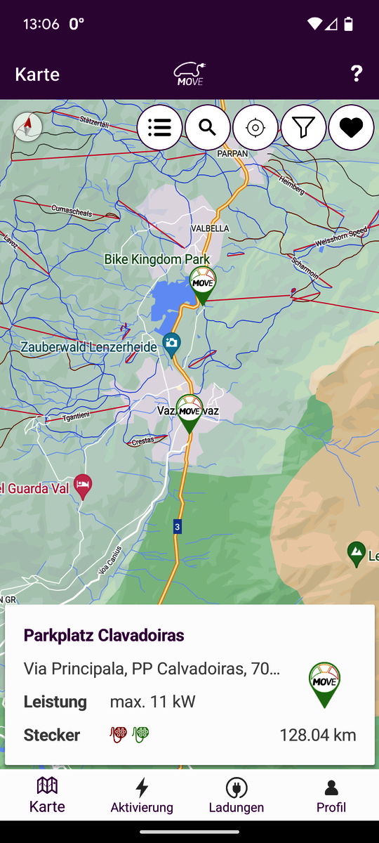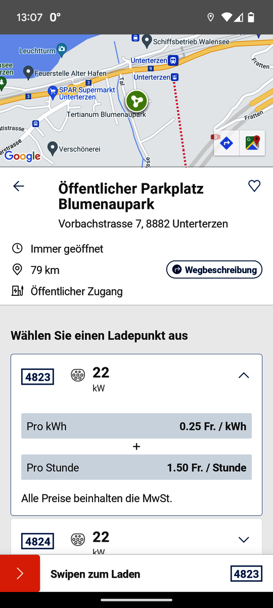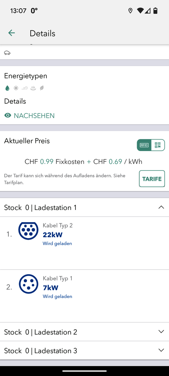 Move hat ebenfalls einen festen Tarif für Roaming-Stationen. Gemäss Stichprobe bezahlen Kundinnen und Kunden mit dem kostenlosen Abo 38.75 Franken für 50 kWh Strom an Roaming-Station. Die Kosten setzen sich aus einer Aktivierungsgebühr von 75 Rappen sowie einem Strompreis von 76 Rappen pro kWh zusammen.) An Move-Ladesäulen bezahlen die Abonnenten zwischen 54 und 70 Rappen pro kWh, was in unserem Beispiel eine Rechnung von 28.50 bis 35 Franken macht. Von einem Zeittarif ist nur an Schnellladestationen die Rede, aber auch hier empfiehlt es sich, die Angaben in der App genau zu studieren, bevor der Ladevorgang gestartet wird.