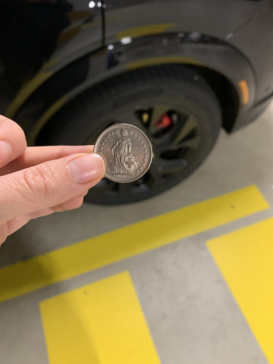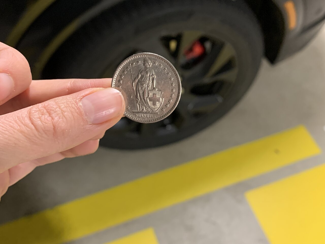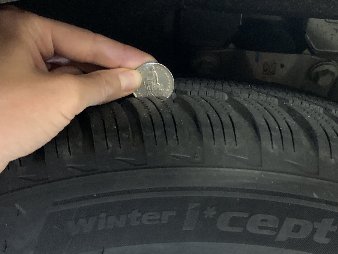 Für die anstehenden Wetterkonditionen sind Winterreifen unabdingbar. Und obwohl die gesetzliche Mindestprofiltiefe 1.6 Millimeter beträgt, werden für eine möglichst sichere Fahrt mindestens 4 Millimeter empfohlen. Überprüfen lässt sich das ganz einfach mit dem Zweifränkler-Trick: Dazu die Münze in die Rillen des Reifens halten – am besten an mehreren Stellen, in der Mitte und aussen. Die Profiltiefe beträgt ungefähr 4 Millimeter, wenn der Sockel der Helvetia nicht sichtbar ist.
