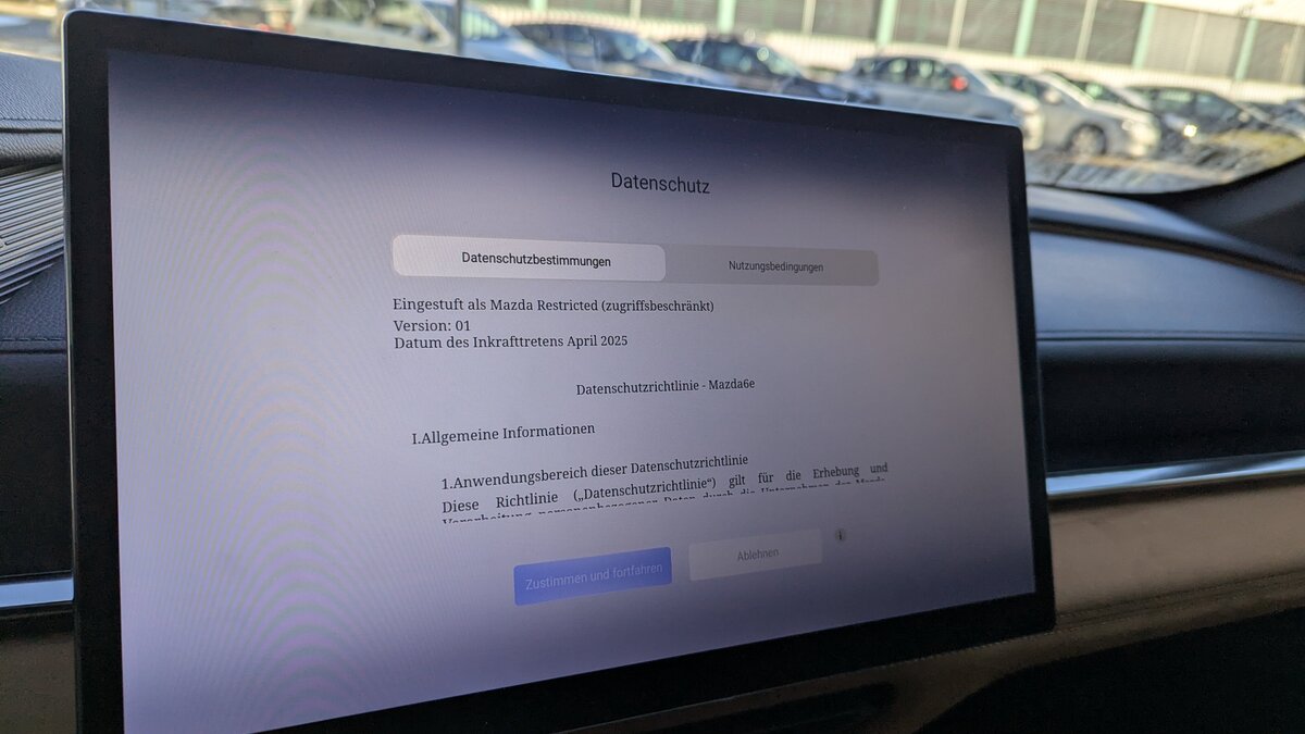 Auch bei der Datenschutzerklärung gibt es noch Verbesserungspotential. Ich musste jedes Mal vor dem Losfahren zwei Erklärungen durchscrollen, bevor ich auf «Akzeptieren» klicken konnte. Ja, wenn ich ein Mazda-Konto erstelle und den 6e damit verbinde, muss ich das nicht mehr machen. Aber nicht alle Menschen wollen immer und überall ein Konto erstellen. Für jene ist die Datenschutzerklärung wie ein Zwang, ein Konto zu erstellen.