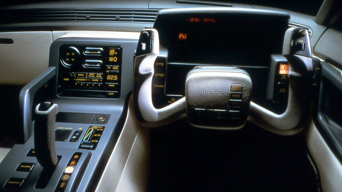 Auch Mazda experimentierte 1985 mit dem Steuerhorn aus dem Flugzeug und veredelte es für das Konzeptauto MX-03 mit einem Lederbezug. Für die japanische Marke war das eher ein Weg zurück in die Normalität. 1981 zeigte Mazda die Studie MX-81 Aria, die auf ein Lenkrad verzichtet. Stattdessen lenkte man über ein Kunststoffgliederband, welches um einen Röhrenbildschirm lief, der als Instrumentenanzeige diente.