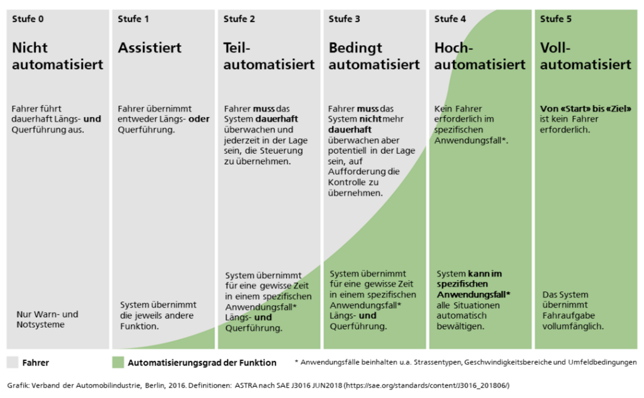 - Stufe 5: Vollautomatisiert: Auf dieser Stufe ist vom «Start» bis zum «Ziel» keine Fahrerin und kein Fahrer mehr notwendig. Das System übernimmt die Fahraufgabe vollumfänglich, sprich bei allen Strassentypen, Geschwindigkeitsbereichen und Umgebungsbedingungen.