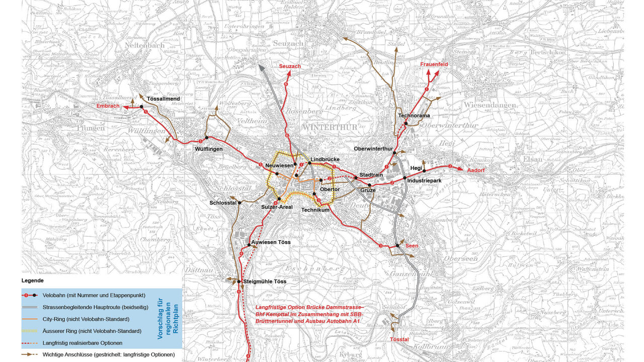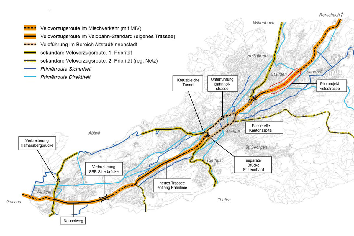 Für die Velostrassen werden teilweise ganze Strassenabschnitte für Motorfahrzeuge aufgehoben und durch neue Markierungen dem zweirädrigen Verkehr zur Verfügung gestellt. Dementsprechend sind die Velovorzugsrouten breit und grundsätzlich autofrei.