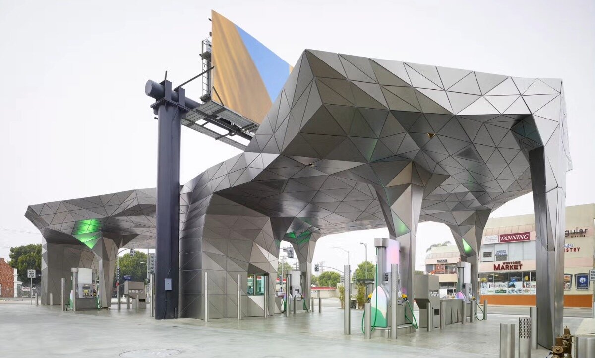 In Los Angeles setzt das Helios House einen vollkommen anderen Akzent. Die von den Büros Office dA und Johnston Marklee gestaltete Anlage wurde als erste «grüne» Tankstelle der USA entwickelt und nutzt recycelte Materialien, eine gefaltete Edelstahlkonstruktion als Dach sowie Solarpanels, die einen Teil des Energiebedarfs decken. Regenwasser wird gesammelt, Grünflächen werden damit bewässert, und selbst die Beleuchtung folgt einem energieeffizienten Konzept.