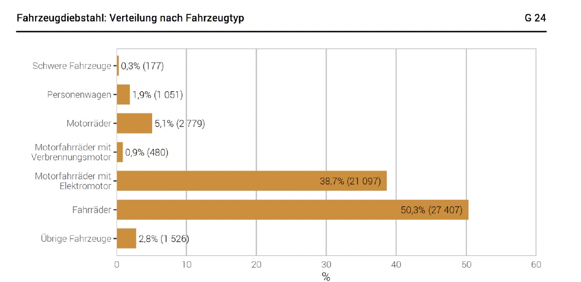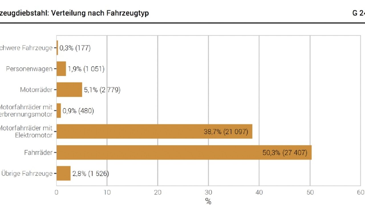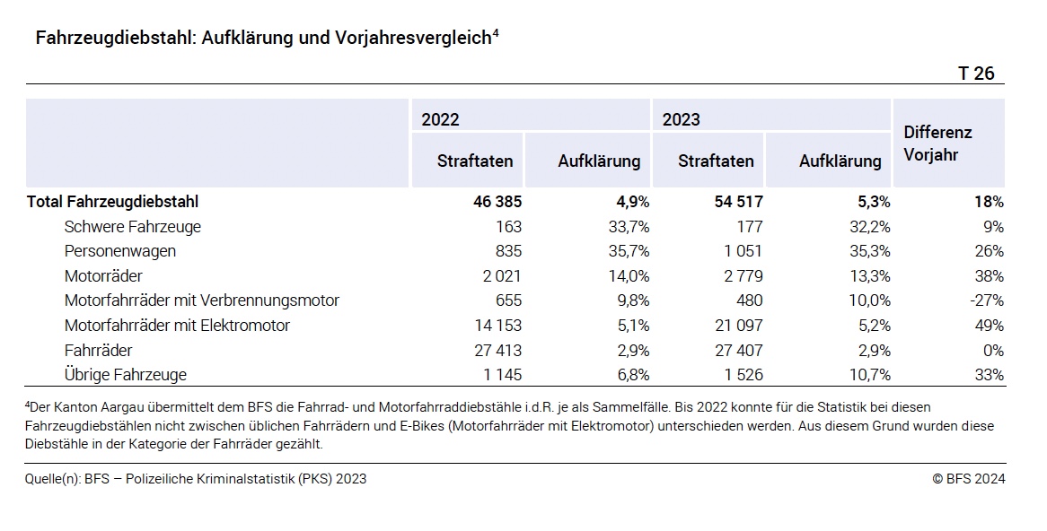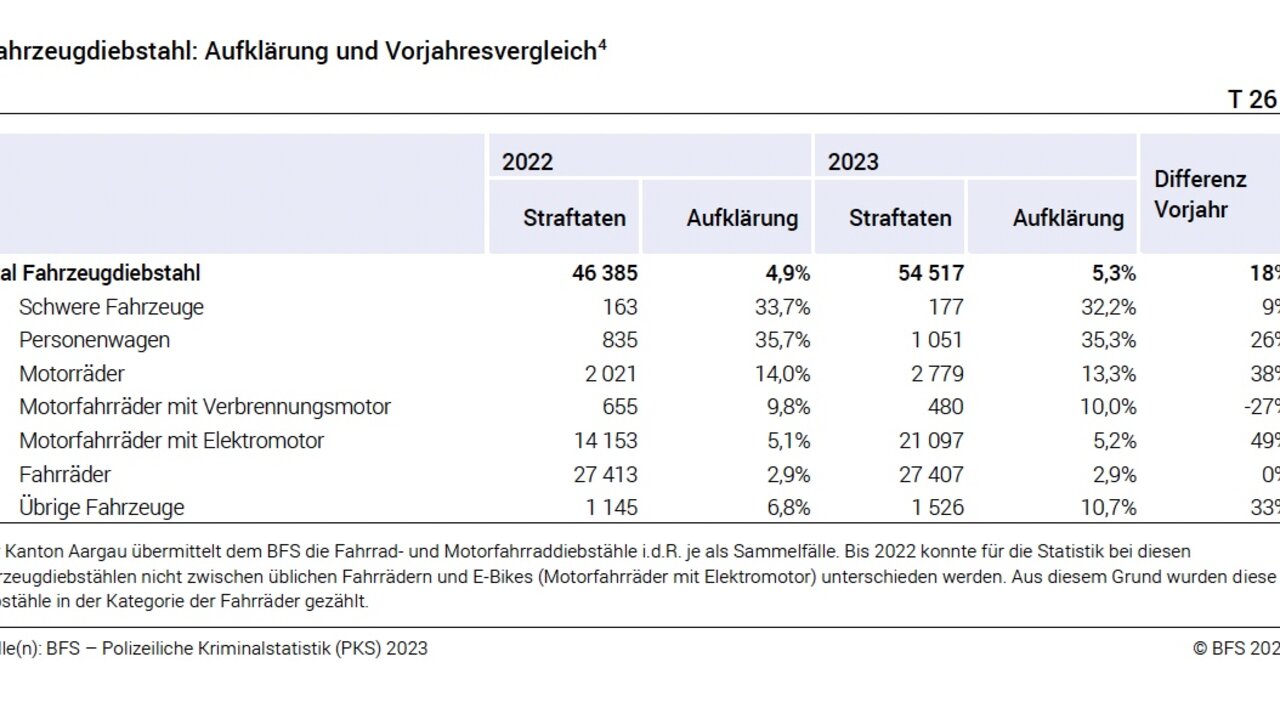 Das zeigen einerseits die Zahlen zu den Diebstählen aus Autos, aber auch die der Fahrzeuge selbst: So wurden laut der Kriminalstatistik von 2023 im Schnitt 3,1 Fahrzeuge (ohne Velos) pro 1000 Einwohner geklaut. Das ist fast ein Fahrzeug mehr als letztes Jahr. Erwischt werden die Täter dabei übrigens nur selten: Gesamtschweizerisch liegt die Aufklärungsquote vom Straftatbestand Fahrzeugdiebstahl nach StGB Art. 139 gerade mal bei 5,3 Prozent und belegt damit den tiefsten Wert bei den Vermögensdelikten. Besonders tief ist die Quote bei den Fahrrädern: Hier werden nur 2,9% aufgeklärt. Bei den Personenwagen-Diebstählen sind es doch mehr als ein Drittel.