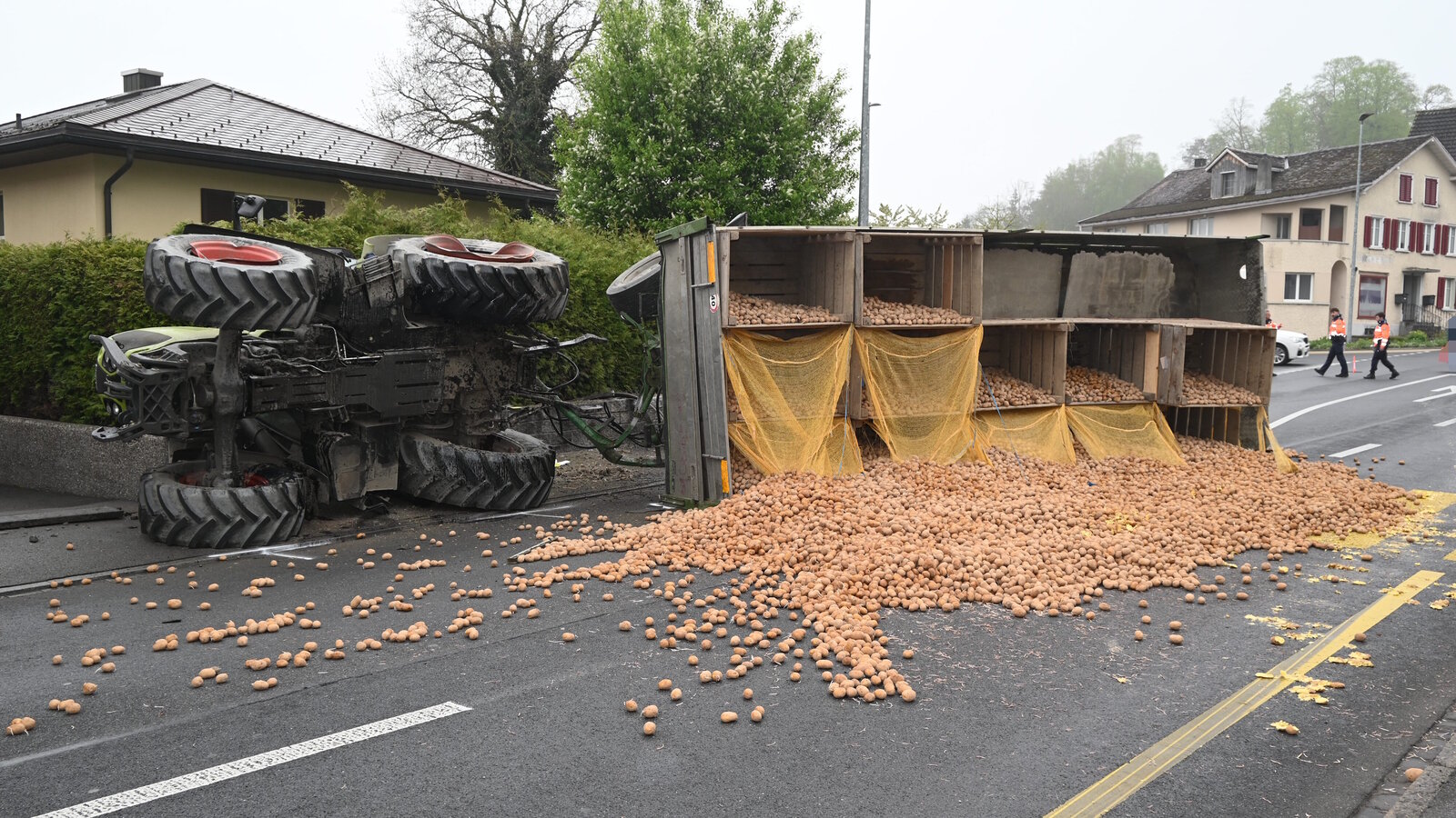Der Traktorlenker kann ausweichen und das Schlimmste verhindern. Doch das Rettungsmanöver hat Folgen: Die Fahrzeugkombination kommt ins Schleudern und der Traktor kippt zur rechten und der Anhänger zur linken Seite auf die Strasse. Somit ist der Kartoffelsalat angerichtet: Ein Grossteil der mitgeführten Kartoffeln fällt vom Anhänger auf die Hauptstrasse und blockierte die komplette Fahrbahn.