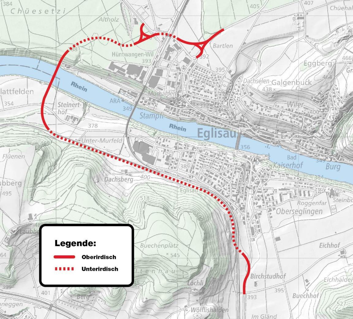 Diese Möglichkeit hat der Kanton Zürich bereits verworfen. Der Tunnel unter dem Rhein würde etwa eine halbe Milliarde teurer werden wie die vorliegende Umfahrungs-Lösung. Eglisaus Gemeindepräsident gibt weiter zu bedenken: «Die Rampen für eine Zufahrt in den Tunnel müssten derart lange sein, dass meines Erachtens der Eingriff in die Natur nicht minder wäre.»