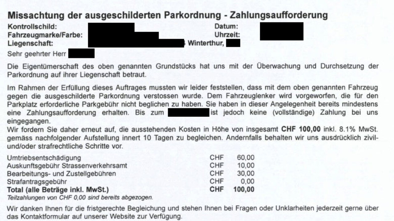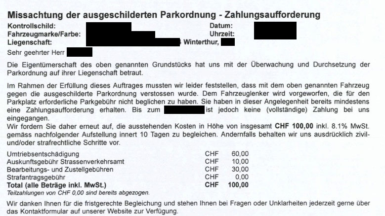 Wer wegen Falschparken auf privatem Grund eine «Busse» von einer privaten Parkkontrollfirma erhält, sollte diese besser rechtzeitig zahlen. Andernfalls drohen hohe Gebühren. Das zeigt die Geschichte eines STREETLIFE-Leserreporters: S.D.* parkierte sein Fahrzeug zwar ordnungsgemäss auf dem Besucherparkplatz einer Wohnüberbauung, überzog jedoch die bezahlte Parkdauer.