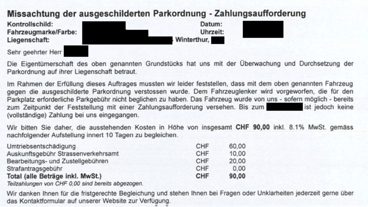Tatsächlich erhält er einen Brief mit der Rechnung von Parkon, jedoch mit einem happigen Aufschlag. Auf der Zahlungserinnerung sind zusätzliche Gebühren von 30 Franken aufgeführt: 20 Franken für Bearbeitungs- und Zustellgebühren, 10 Franken kostet die Auskunft beim Strassenverkehrsamt. Denn: S.D. hat bei seinem Kontrollschild eine Auskunftssperre hinterlegt. Die 60 Franken Umtriebsentschädigung sind gerade um 50 Prozent teurer geworden.