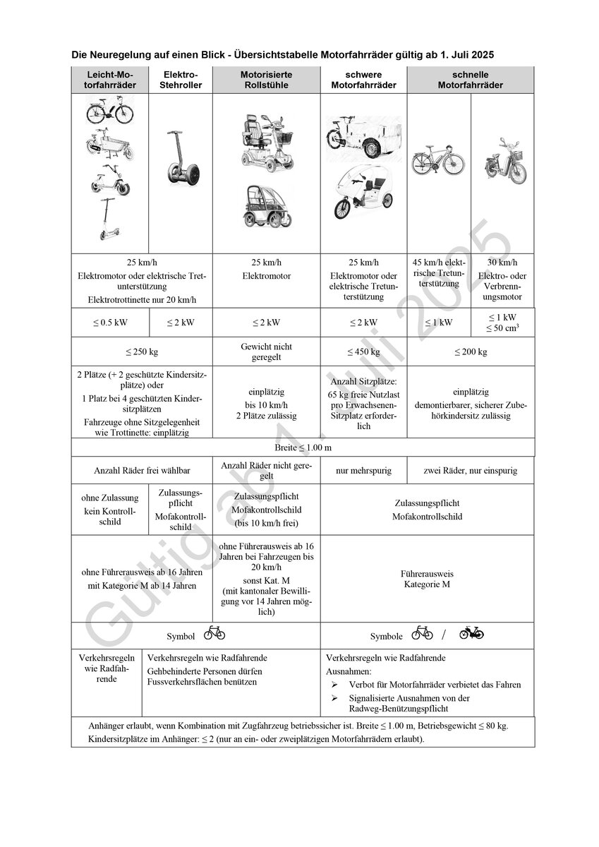 Die schweren Motorfahrräder dürfen maximal 25 km/h fahren, brauchen ein Mofa-Kontrollschild und benötigen den Führerausweis M (Motorfahrrad). Sie dürfen maximal einen Meter breit sein. Es macht keinen Unterschied, ob der E-Motor nur beim Treten unterstützt oder allein für den Antrieb verantwortlich ist.