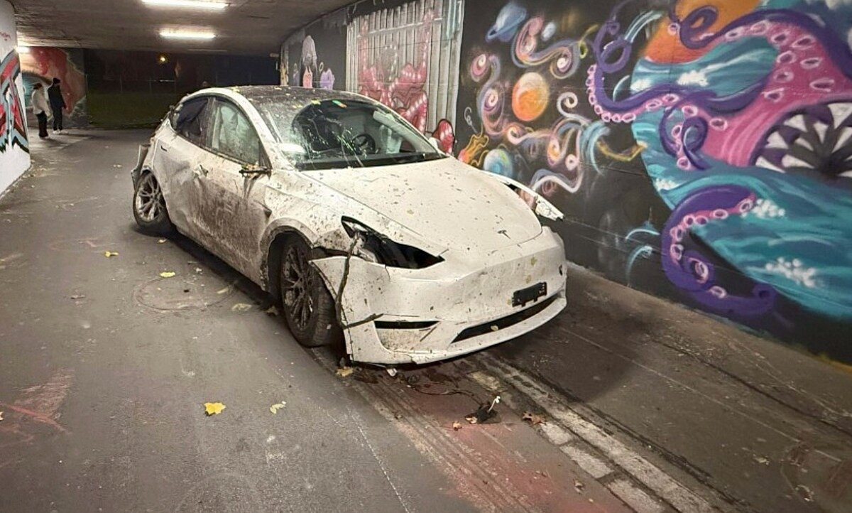 Da staunten die Passanten nicht schlecht. In einer Strassenunterführung trafen sie am Sonntagmorgen unverhofft auf einen demolierten Tesla. Zunächst war unklar, wie der Wagen überhaupt dorthin gekommen war.