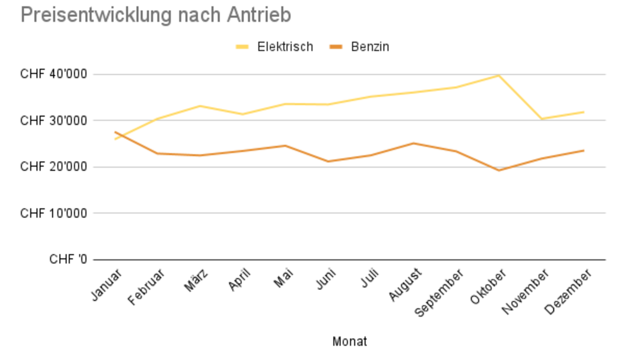 Zumindest war dies bis im Oktober so. Da erreichte der Preisunterschied einen Peak von über 20'000 Franken. Während der e-208 im Schnitt 39'000 Franken kostet, wurden für einen Benziner nur 19'000 Franken fällig. Der Jahreshöchstwert für den Stromer traf auf den tiefsten Durchschnittspreis des Jahres für den normalen 208. Danach haben sie sich im November auf 10'000 Franken angenähert und sind im Dezember parallel gestiegen.