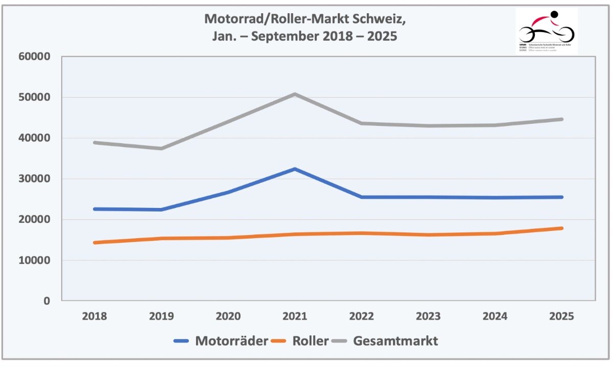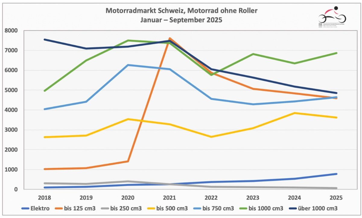 Während der Automarkt in der Schweiz ins Stocken gerät, zeigt sich der Motorradmarkt in der Schweiz weiterhin erstaunlich robust. 44’631 Neuzulassungen in den ersten neun Monaten 2025 – ein Plus von 3,43 Prozent. Keine Revolution – aber in einem Jahr, in dem alles irgendwie stagniert, ist das schon fast ein kleines Wunder.