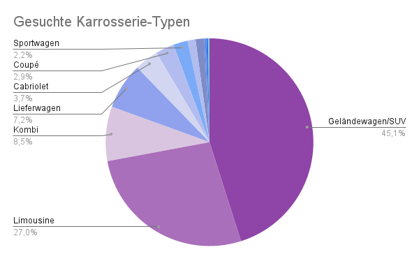 Diese Annahme wird durch Online-Marktplätzen wie Carmarket gestützt. Hier zeigt sich ein klares Bild, was die Schweizer Kundschaft will: SUVs. 45,1 Prozent aller Suchanfragen seit der Aufschaltung des Marktplatzes Mitte 2023 bis zum 30. Mai 2024 betreffen einen SUV. Die Kombis folgen mit 8,5 Prozent erst auf Platz 3. Die Limousinen haben sich mit 27 Prozent der Suchanfragen dazwischengeschoben. Dass diese Zahl tiefer liegt, als bei den Verkaufszahlen liegt daran, dass die Userinnen und User auf Carmarket nach mehr Karosserie-Formen suchen können, als die Verkaufsstatistik unterscheidet. So stehen auch Coupés, Vans sowie leichte Nutzfahrzeuge wie Pick-ups oder Wohnmobile zur Auswahl.