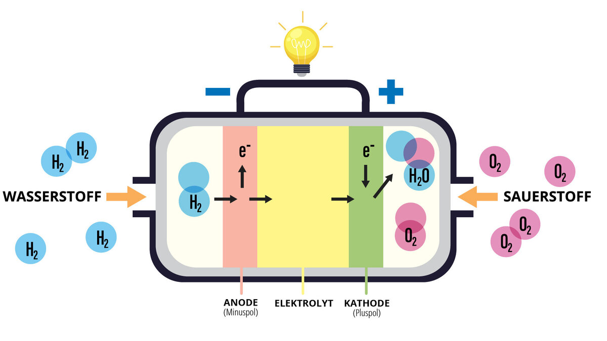 Korrekterweise muss man bei Wasserstoffautos von Brennstoffzellen-Autos sprechen. Denn die Fahrzeuge sind mit einer solchen Brennstoffzelle ausgestattet. Diese ist im Aufbau und der Funktionsweise mit einer Batterie vergleichbar. So hat auch eine Brennstoffzelle einen Plus- und Minuspol, die aufeinander reagieren und Energie erzeugen. Diese wird für den Antrieb des Autos genutzt. Für diese chemische Reaktion braucht es jedoch eine Art Treibstoff: eben den Wasserstoff. Dieses Gas reagiert innerhalb der Brennstoffzelle chemisch mit Sauerstoff. Dabei wird die im Wasserstoff gespeicherte Energie als Strom freigegeben – völlig automatisch. Man bezeichnet diese elektrochemische Reaktion auch als «kalte Verbrennung». Dieser freigegebene Strom wird dann genutzt, um den Elektromotor des Fahrzeugs anzutreiben.