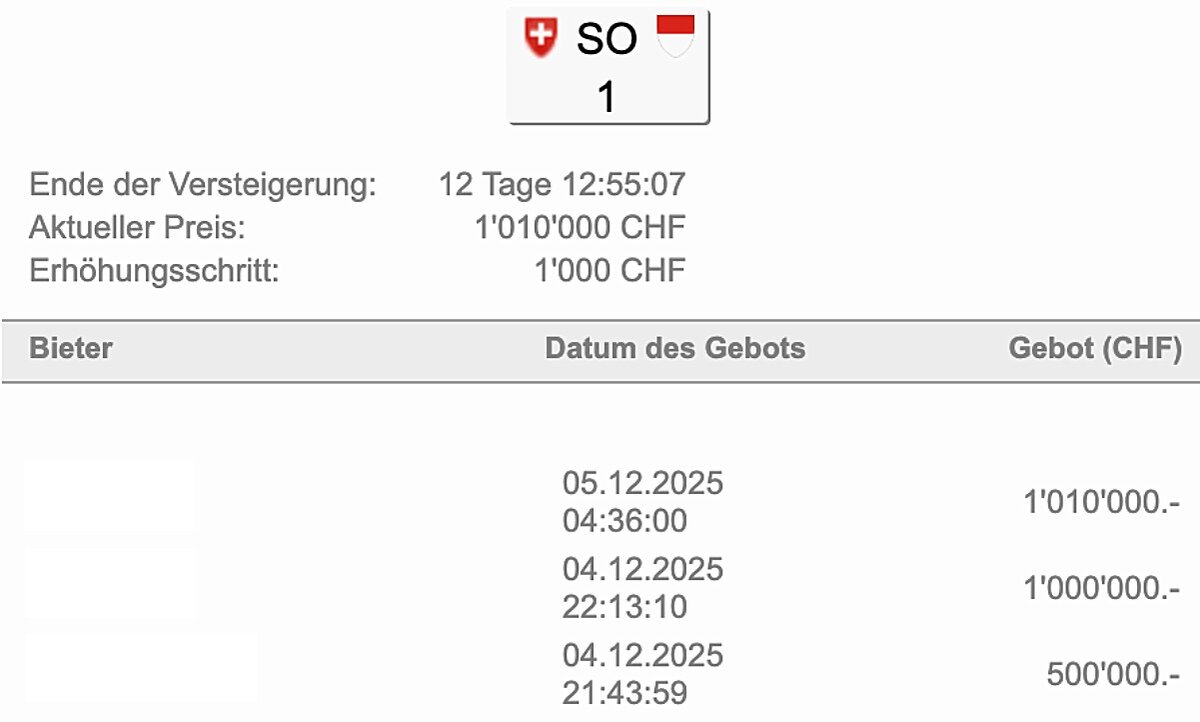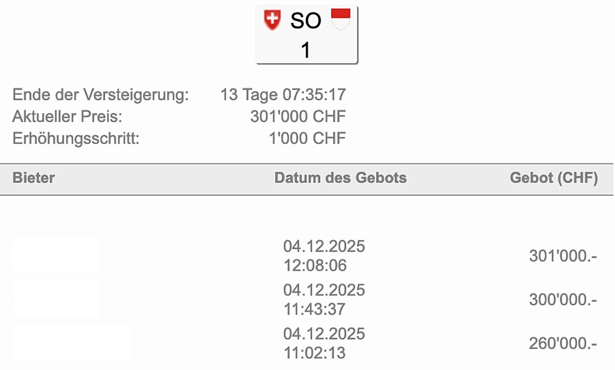 Nur wenige Stunden nach Start der Auktion knackte das Autokennzeichen «SO 1» bereits den Schweizer Rekord. Der lag seit Juli 2024 bei 299'000 Franken für das Nummernschild «ZH 24». Kurz nach Mittag am Donnerstag lag das letzte Gebot bei 301'000 Franken.
