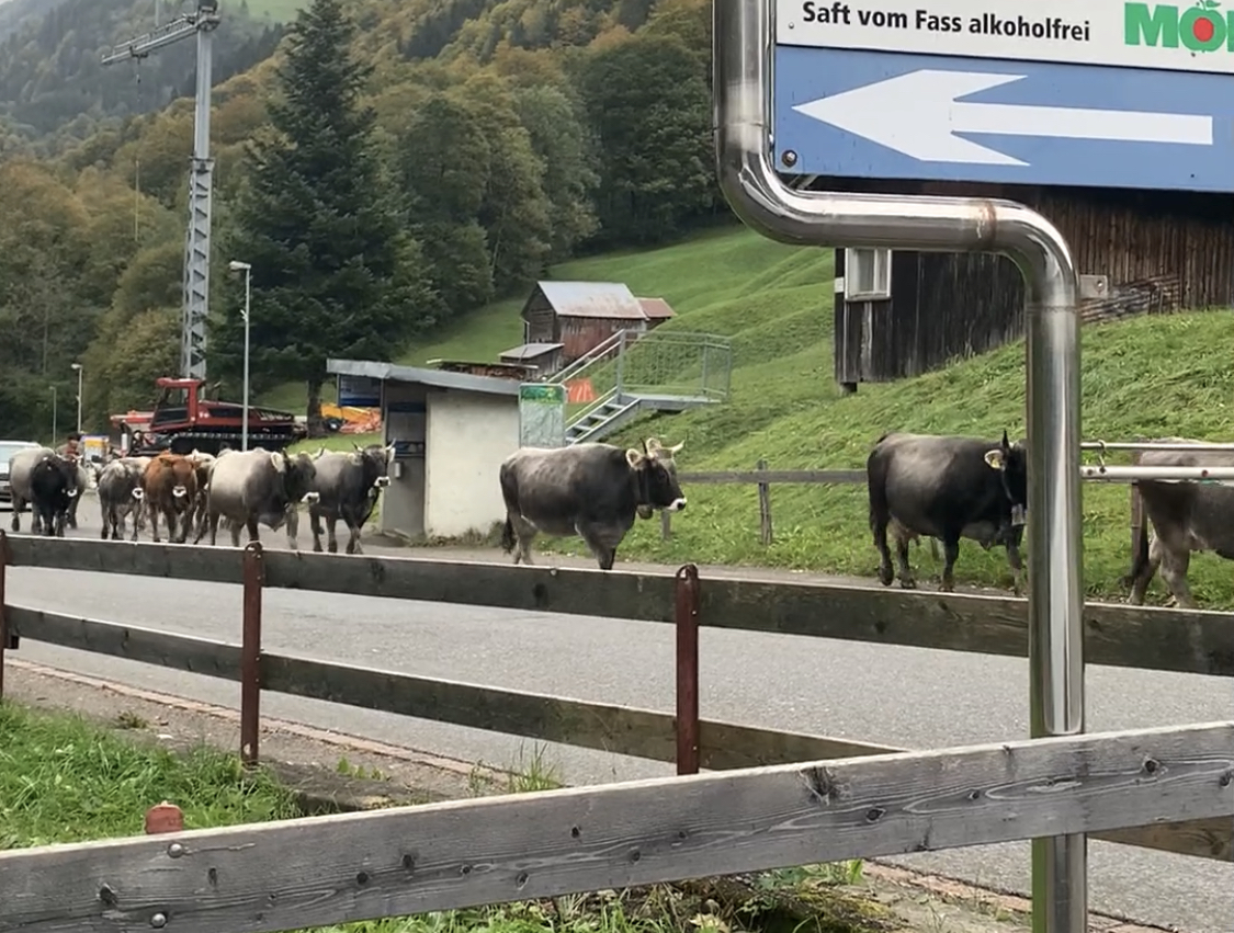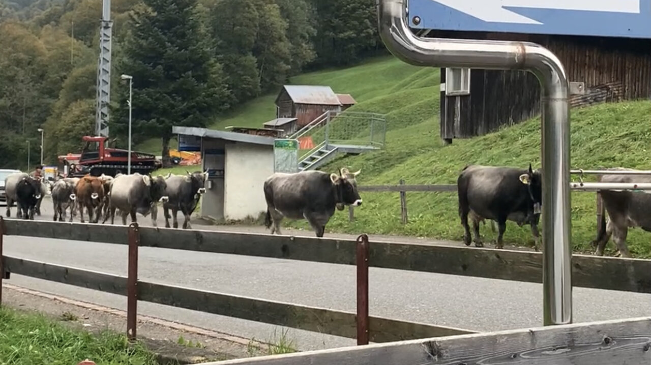 Auf dem Weg zur Weide müssen Tiere manchmal Strassen überqueren. Um ihr Vieh sicher von A nach B zu geleiten, sperren Landwirte die betroffene Strasse meistens kurz ab, zum Beispiel mit einem Flatterband.