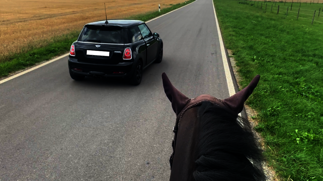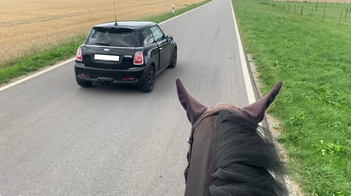 An der Kutsche oder mit einem Reiter sind Pferde im Strassenverkehr einem Auto gleichgestellt: Sie müssen sich auf der Strasse fortbewegen und dürfen nicht auf dem Geh- oder Veloweg unterwegs sein. Autofahrende sollten stets viel Abstand halten, denn Pferde sind Fluchttiere.