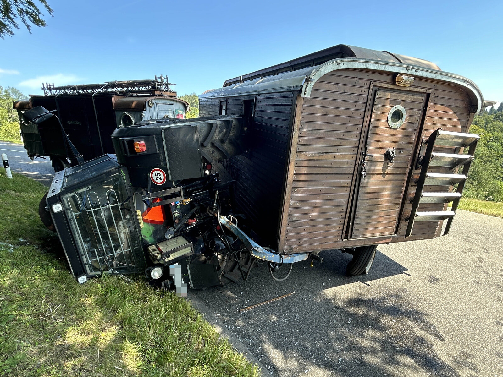 Am Donnerstag kam es zu einem Unfall mit einem Traktor und seinen angehängten Zirkuswagons. Aufgrund der aufwändigen Bergung war die Strasse für mehrere Stunden nicht befahrbar.