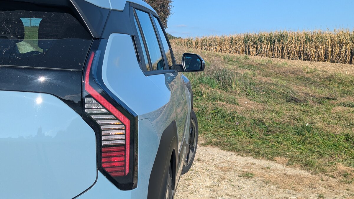 Hinter dieser Heckklappe verblüfft der kleinste Elektro-Kia mit seinem Platzangebot. Der Einstiegsstromer gehört mit einer Länge von 4,3 Metern in die Kompaktklasse und kann sich da mit dem Bestseller, dem VW Golf, messen. Der Kofferraum bietet ein Ladevolumen von 460 bis 1250 Litern und übertrifft den deutschen Konkurrenten. Mich überraschen die Zahlen, weil ich auf das Design hereingefallen bin. Optisch wirkt der EV3 kleiner, die breite C-Säule und das schmale Heckfenster lassen einen kleinen Kofferraum erwarten. Aber er packt mehr als genug – selbst für die monatliche Fahrt zum Recyclinghof.