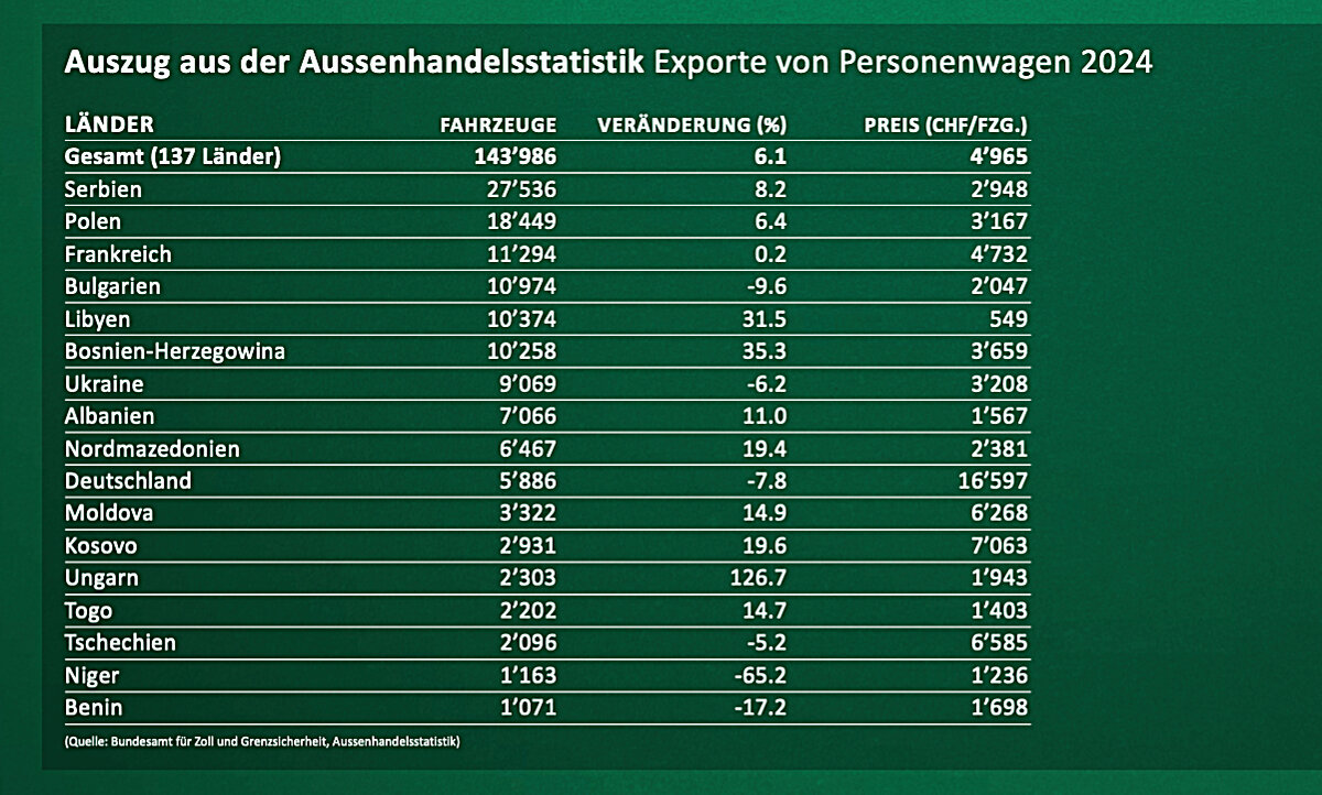 2024 war Serbien die Top-Abnehmerdestination für Schweizer Occasionen. Von den insgesamt 143'986 exportierten Fahrzeugen gelangten 27'536 Autos in den Balkanstaat. Also fast jedes fünfte Auto. Der durchschnittliche Fahrzeugpreis lag bei 2948 Franken. Auf den weiteren Plätzen folgten Polen, Frankreich, und Bulgarien.