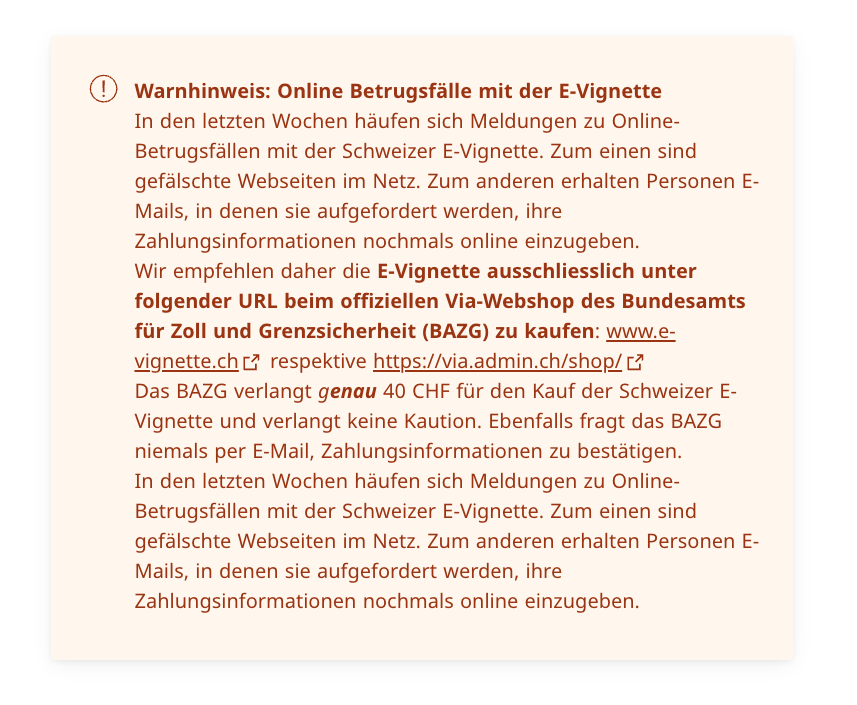 Selbst mögliche Betrugsversuche im Zusammenhang mit der E-Vignette vermögen ihren Vormarsch und ihre Beliebtheit nicht zu bremsen. Dass der Autor auch die Hauptseite der Zollbehörde bazg.admin.ch vorübergehend nicht erreichte, kann auch Indiz dafür sein, dass sich die Userinnen und User an die Sicherheitsratschläge des BAZG halten. Wegen möglicher Betrugsfälle empfiehlt die Zollbehörde, die E-Vignette nur über den offiziellen Webshop des BAZG zu kaufen. Dieser ist über e-vignette.ch oder via.admin.ch/shop erreichbar. Die Vignette kostet genau 40 Franken. «Das BAZG verlangt keine Kaution und die User müssen die Zahlungsinformationen auch nicht per Mail bestätigen», erklärt Sprecher Varga. In solchen Fällen sollte der Kauf abgebrochen werden, weil es sich um Betrugsversuche handelt.