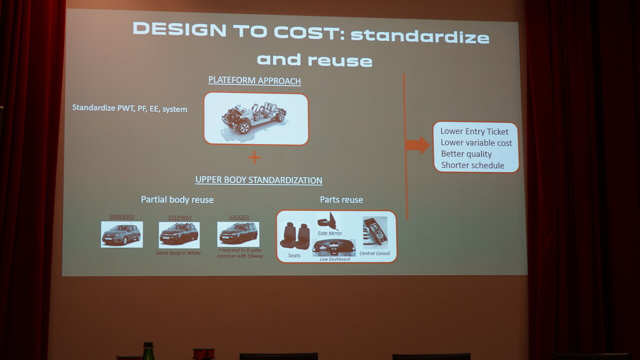 In Rumänien sind Monatslöhne zudem derart tief, dass man fast erschrickt: 1600 Franken brutto im Schnitt. Zum Vergleich: Frankreich 2800, Schweiz 6800 Franken – und Personalkosten machen 20 Prozent vom Preis eines Autos aus. Aber am Design wird nicht gespart, denn neue Dacias sehen ja cool aus – oder? Denkste! Marc Suss, Dacia-Entwicklungschef: «Wir nennen das Design to Cost. Standardisierte Antriebe und Teile sparen Kosten.» Zum Beispiel sind Stepway und Jogger bis zur B-Säule gleich; auch die Sitze, Spiegel und Mittelkonsolen sind identisch. Im Jogger sind die Rückbänke falt- und demontier-, nicht jedoch längs verschiebbar, die dritte Reihe dieselbe wie im Lodgy. Dies habe, so Suss, die Kosten der Sitze halbiert.