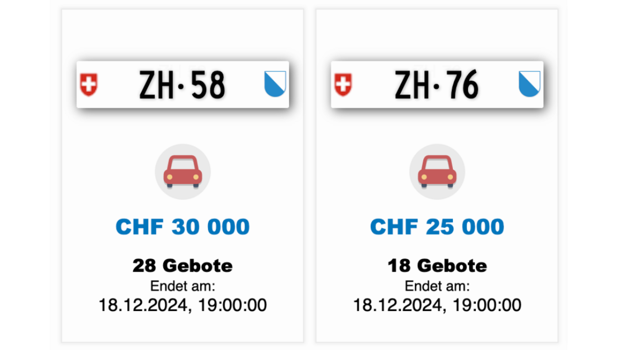 Aktuell hat Fehr die Nase vorn. Bereits sind 28 Gebote auf das Kontrollschild «ZH 58» eingeganen und der Preis liegt bei 30'000 Franken. Auf Ricklis «ZH 76» wurde schon 18 Mal geboten, was zu einem vorläufigen Zwischenstand von 25'000 Franken führt. Die online Auktion startete am Donnerstag und läuft noch bis nächsten Mittwoch, 18. Dezember um 19 Uhr.